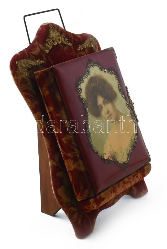 cca 1900 Díszes fotóalbum, tükörrel, fa állvánnyal, restaurált, album: 27×22 cm, állvány: 44×28 cm