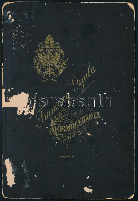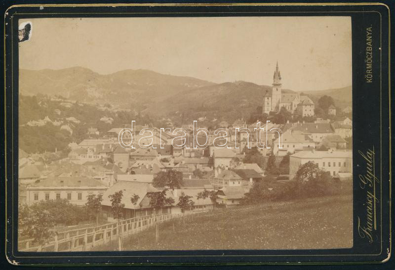 cca 1900 Körmöcbánya látképe, keményhátú fotó Franciscy Gyula fényképész műterméből, a fotó egyik felső sarkán sérüléssel, de ez a látképet nem érinti), kartonon kopásnyomokkal, 11x16 cm/ cca 1900 View of Kremnica (Körmöcbánya/Kremnitz), boardphoto, Franciscy Gyula, damaged, worn, 11x16 cm