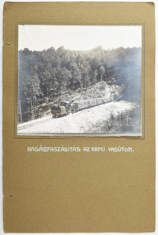 Description: cca 1905 Erdély hasábfaszállítás az erdei vasúton Krassó-Szörény vármegyében. Az Osztrák-Magyar Vasúttársaság létesítménye. Nagy méretű fotó 28x22 cm Kartonon / 1905, Transylvania, woodtransportation on forrest railway. Krassó-Szörény County. A facility of the Austro-Hungarian Railway Company. Large-sized photo."