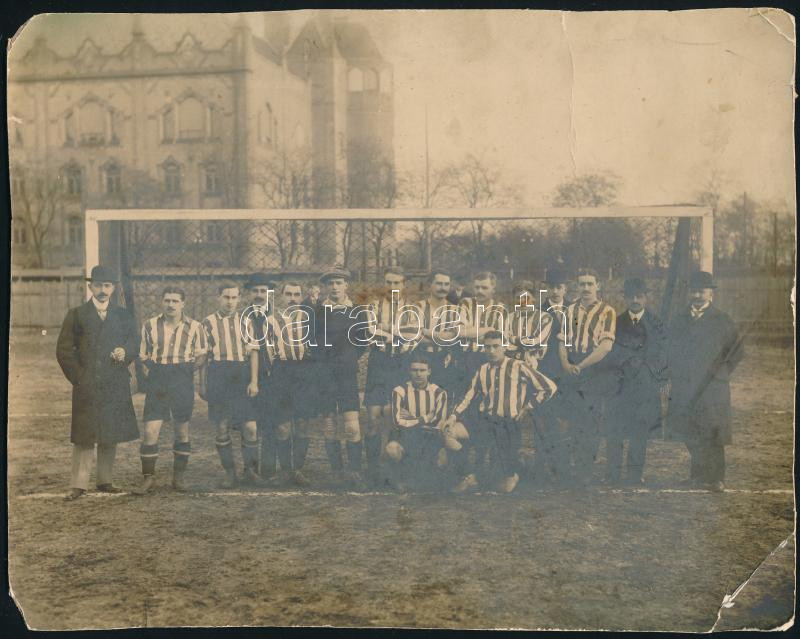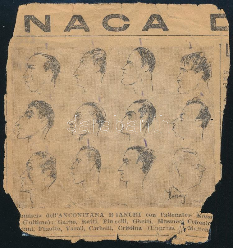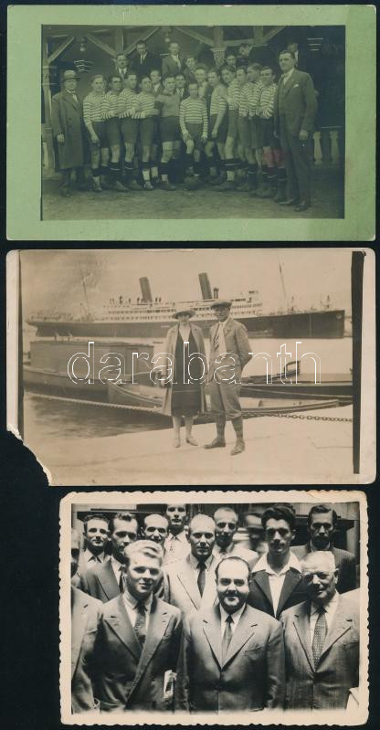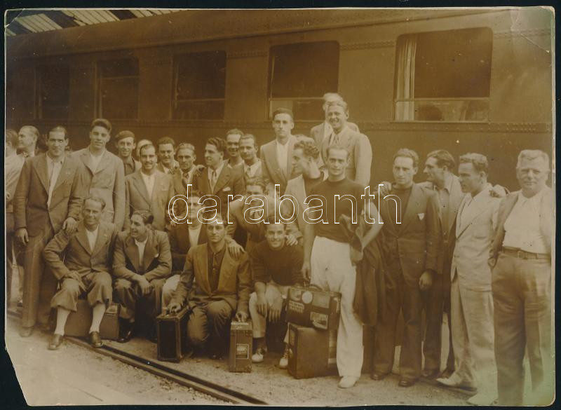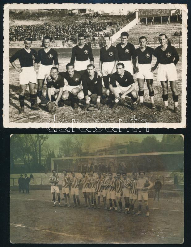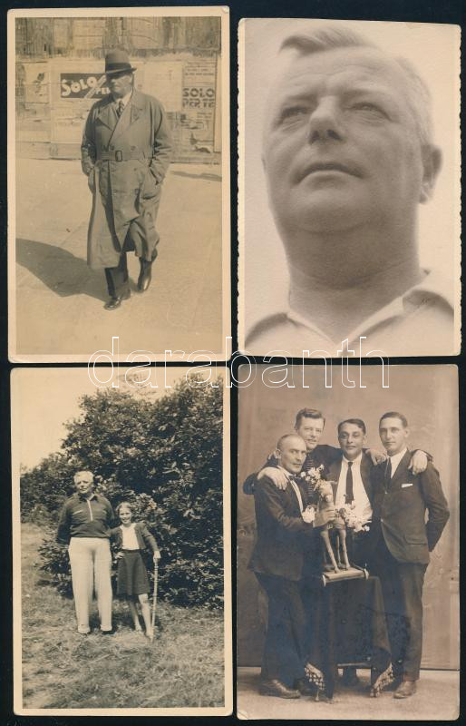 cca 1910-1955 Kőszegi György (1888-1955) labdarúgó, labdarúgó edző fotó hagyatéka, sok családi fotó, de közte csapatfotók is, Budapesti Torna Club (zuglói Millenáris sportpálya), CS Firenze (1923, CS Firenze - Perugia, 1923. XII. 9.), Anconitana (ma: U.S. Ancona, Anconitana - Alessandria, 1937. XII.), újságkivágással, és olasz nyelvű halálozási értesítővel, ami szerint a halálozási dátuma sok helyen téves. Nem 1961, hanem 1955! Összesen 18 fotóval. Változó állapotban, közte sérült. Kőszegi György (1888-1955) az MTK-nál kezdte a labdarúgást, majd 1908-tól 1921-ig Budapesti TC játékosa volt. Ezután Olaszországban, a Prato SC csapatában folytatta pályafutását mint játékos-edző. 1924-től a CS Firenze, 1926-tól a Pistoiese edzője volt. 1928-ban hazatért, s előbb a BTC-nél, majd a Tatabányánál vállalt munkát, ám 1929-ben visszatért a Pratohoz. Innentől már csak Olaszországban dolgozott, kétszer is edzősködött a Pistoiese együttesénél, de megfordult a Padova, az Anconitana, a Signe, a Taranto és a Catanzarese csapatainál is. 1940-ben elhagyta Olaszországot, s csak a háború után tért vissza, 1947-ben ismét a Prato edzője lett, végül 1949-ben, az Anconitana trénereként vonult vissza a labdarúgástól. Egyszeres válogatott, egy Budapest-Bécs mérkőzésen lépett pályára, melyet az osztrákok 5-2-re megnyertek./ cca 1910-1955 Photo heritage of György (Giorgio) Kőszegi football player and coach, with a lot of family photo (18 pc.), but some team photo too, BTC, CS Firenze, Anconitana (today: U.S. Ancona), with one newspaper clipping, with the death notice in Italian language. With correct death date on the the notice: 1955! And not 1961! The part of the photos are damaged.
