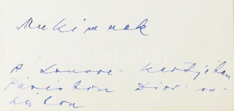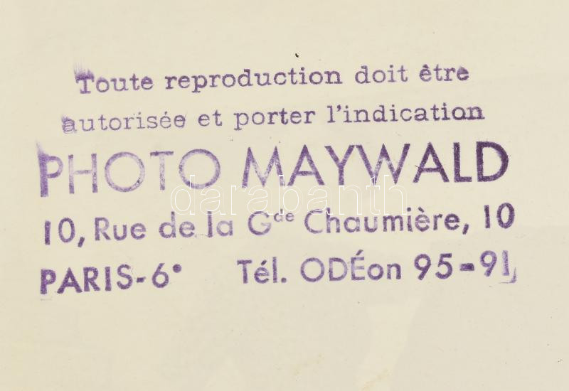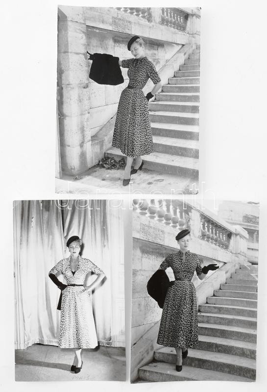 cca 1950-60 Christian Dior 3 db divatfotó, Lénárt Angéla magyar modell. Hátoldalán Photo Maywald, Paris pecsétjével jelzett és az egyiken Lénárt Angéla autográf feliratával: "Mukimnak A Louvre kertjében Párizsban Dior ruhában". 14,5x9 14,5x11 cm közötti méretekben. / cca 1950-60 Christian Dior 3 fashion photos, with Angéla Lénárt Hungarina model. With the stamp of Photo Maywald, Paris on the reverse. Between 14,5x9 and 14,5x11 cm