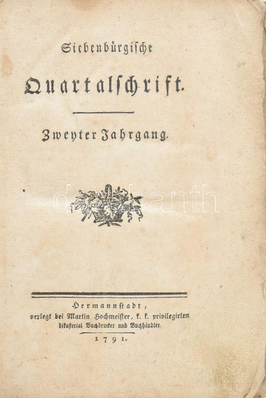 1791 Siebenbürgische Quartalschrift. Zweyter Jahrgang. Teljes 2. évfolyam. Hermannstadt (Nagyszeben), 1791, Martin Hochmeister, 4+434+VII p. + 1 (kihajtható tábla) t. Korabeli kartonált papírkötés, kopott borítóval, a gerincen hiánnyal, foltos lapokkal, egy lapon apró (I/II.) hiánnyal, 1875-ös nagyszebeni tulajdonosi névbélyegzéssel.