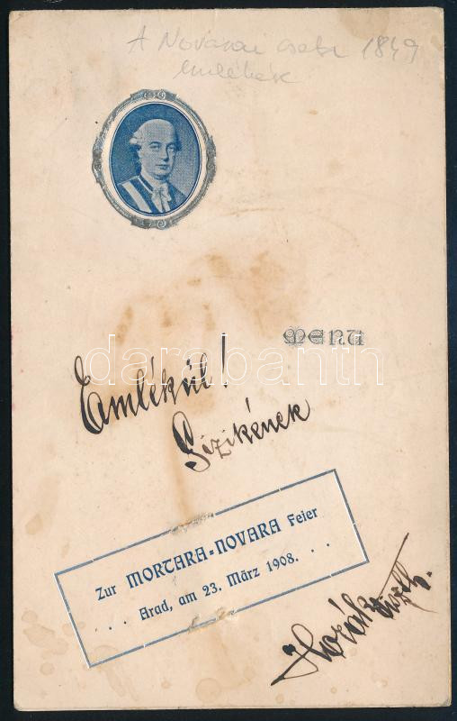 1908 Arad, a novarai csata emlékére rendezett ünnepi ebéd menüje, aláí...