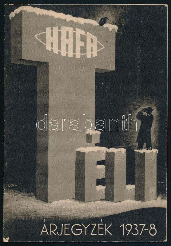 Description: 1937 Hatschek és Farkas fotó, amatőrmozi, optikai és rádiószaküzlet, foto-mozilaboratórium. 78. képekkel illusztrált téli árjegyzéke. 1937-1938. A borító illusztrációja Bortnyik Sándor (1893-1976) munkája. Bp.,1937, Tolnai-ny.,19+12+1 p. Kiadói papírkötés.