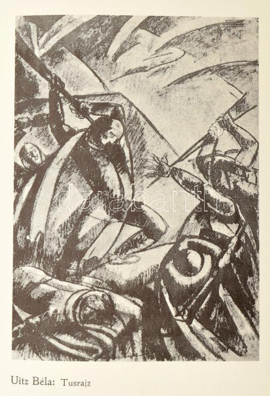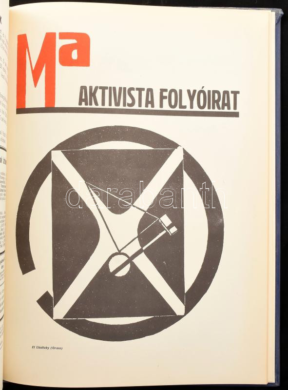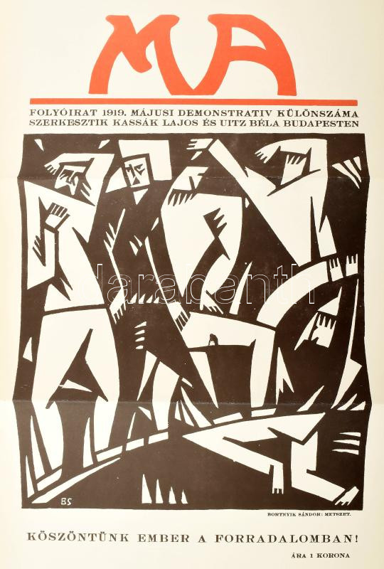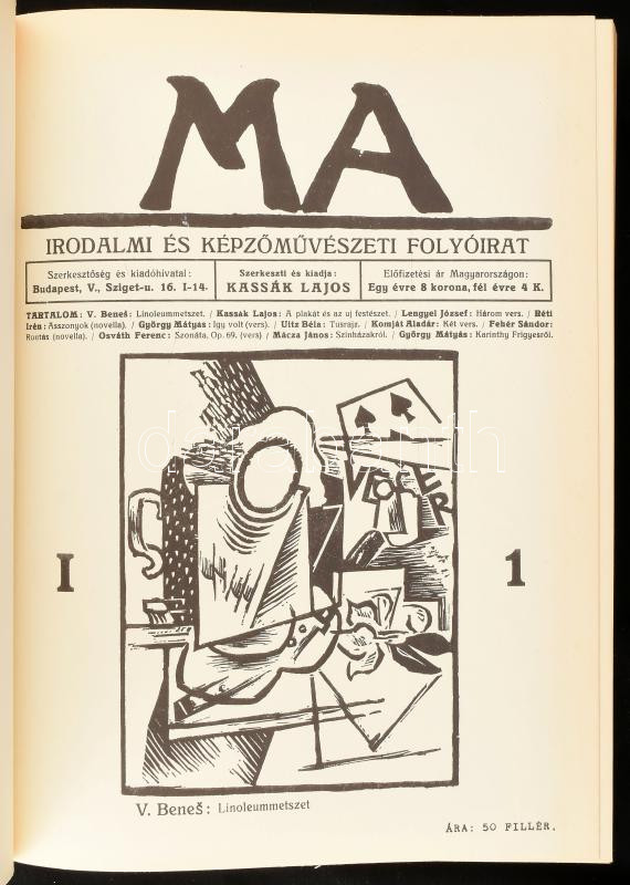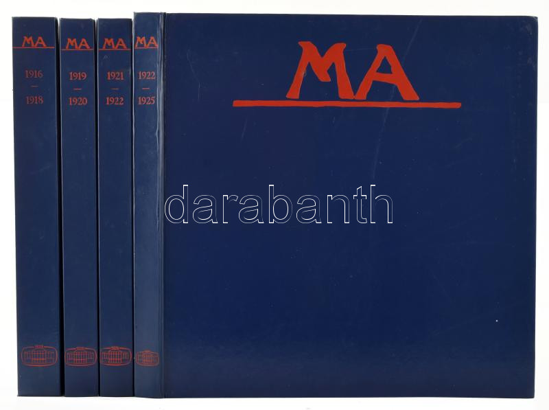 MA. Aktivista művészeti és társadalmi folyóirat. 1-4. köt. Szerk.: Kassák Lajos, Uitz Béla.. Teljes, reprint kiadás: Bp.-Wien, 1916-1925. 1-10. évf. Bp., 1971. Akadémiai. A 4. kötetben 3 melléklettel. Kiadói festett nyl-kötésben. Benne rengeteg Kassák Lajos, és Bornyik Sándor vonatkozású részel. A Bortnyik Sándor grafikai vonatkozású részek a következők: 4. Bortnyik művei a MA számaiban 4.1. Bortnyik Sándor: Eredeti linóleummetszet, 1918 1918. III. 7. sz. címlapon [Lovas] 4.2. Bortnyik Sándor: Eredeti linóleummetszet, 1918 1918. III. 8-9. sz. egész oldalas reprodukció [Illusztráció Barta Sándor verséhez] 4.3. Metszet aláírás nélkül, 1918 1918. III. 12. sz. Internacionális szám címlapon [Vörös zászló] 4.4. Reprodukció Bortnyik Sándor aláírásával, 1919 1919. IV. 1. sz. címlapon [Illusztráció Újvári Erzsi verséhez] 4.5. Bortnyik Sándor: Metszet, 1919 1919. január. Első világszemléleti különszám címlapon [Kommunista köztársaságot!] 4.6. Bortnyik Sándor: Linóleum-metszet, 1919 1919. IV. 5. sz. címlapon [Küzdelem] 4.7. Bortnyik Sándor: Linóleum-metszet, 1919 1919. IV. 7. sz. címlapon [Evezősök] 4.8. Bortnyik Sándor: Metszet, 1919 1919. májusi demonstratív különszám címlapon [Kompozíció öt alakkal] 4.9. Bortnyik Sándor: Metszet, 1919 Világszemléleti harmadik különszám címlapon [Liebknecht] 4.10. Bortnyik Sándor: Metszet, 1919 Világszemléleti negyedik különszám címlapon [Lenin] 4.11. Egész oldalas metszet aláírás nélkül, 1920 1920. V. 3. sz. június 1. címlapon [Zászlóvivők] 4.12. Egész oldalas metszet aláírás nélkül címlapon, 1918 Manifest zum internationalen Kongress der Intellektuellen. Herausgegeben von den ungarländischen Künstlern. (6 Sonderheft der Zeitschrift "MA". 23. Oktober) [Vörös Nap] 4.13. Egész oldalas fametszet cím és jelzet nélkül, 1921 1921. VI. 1-2. sz. címlapon [Absztrakt kompozíció] 4.14. Bortnyik Sándor: Rajz, 1920 1921. VI. 5. sz. március 15. szövegközti illusztráció 63. lapon [Zászlóvivők] In Bakos Katalin: Bortnyik Sándor és a Műhely. Bortnyik Sándor tervezőgrafikai munkássága (1914-1947) és a "magyar bauhaus" (1928-1938). (Határesetek No. 5.) Bp., 2018, L'Harmattan Könyvkiadó-Kossuth Klub, pp. 260., 273-274.