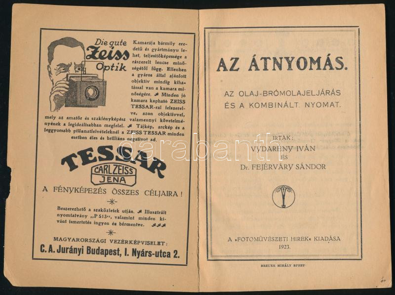 Vydarény Iván - Dr. Fejérváry Sándor: Az átnyomás. Az olaj-bromolajeljárás és kombinált nyomat. Bp., 1923, "Fotoművészeti HÃrek", (Breuer Mihály-ny.), 88+8 p. Kiadói papÃrkötés, az elülsÅ‘ borÃtón kis hiánnyal, foltos.