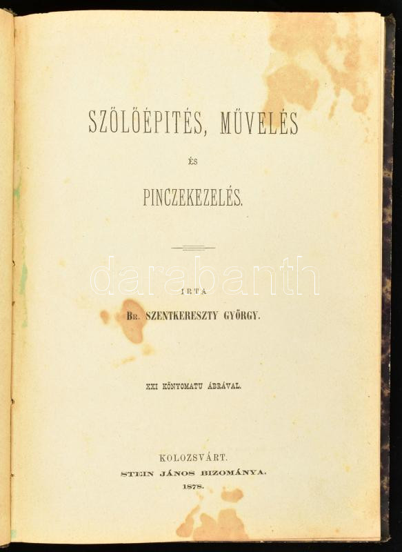 Description: Br. Szentkereszty György: Szőlőépítés, művelés és pinczekezelés. XXI. kőnyomatu ábrával. Kolozsvárt, 1878, Stein János, 168+4 p.+15 (Rajtuk XXI kőnyomatú ábrval) t. Első kiadás. Átkötött korabeli félvászon-kötés, foltos lapokkal, aláhúzásokkal. Rendkívül ritka!