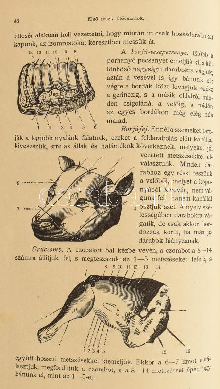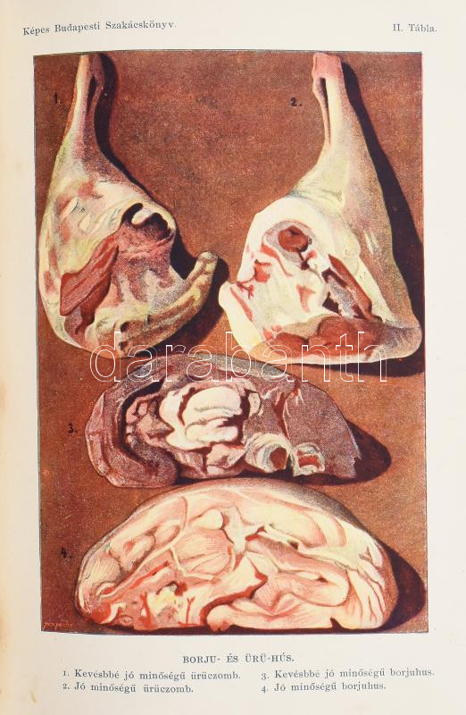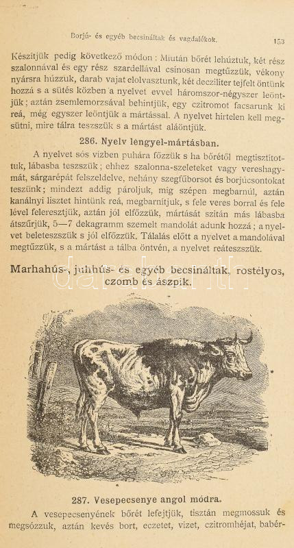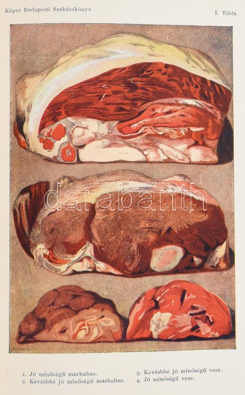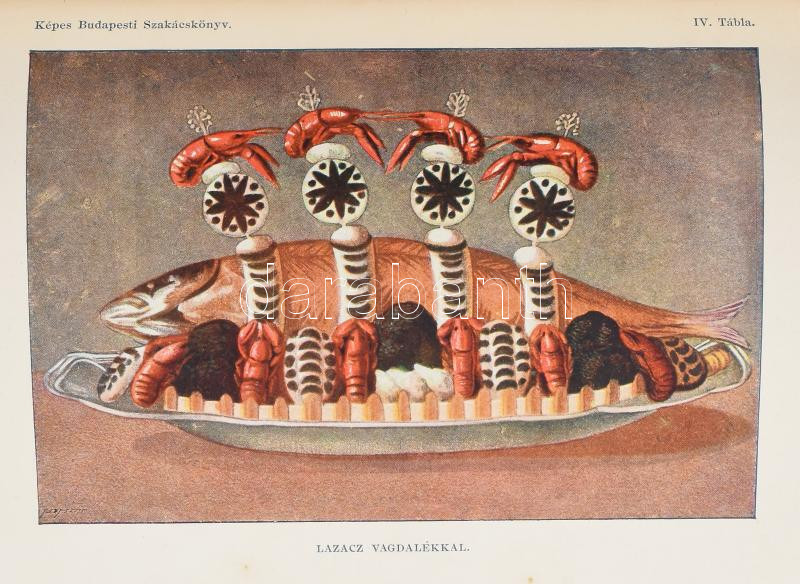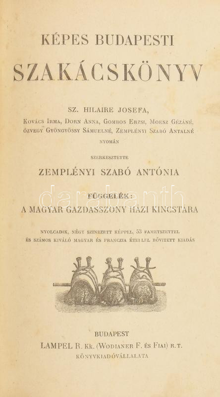 Zemplényi Szabó Antónia: Képes budapesti szakácskönyv. Sz. Hilaire Josefa, Kovács Irma, Dorn Anna, Gombos Erzsi, Moesz Gézáné, özvegy Gyöngyössy Sámuelné, Zemplényi Szabó Antalné nyomán szerkesztette: - -. Függelék: a Magyar gazdasszony házi kincstára c. munkával. Nyolcadik, négy színezett képpel, 53 fametszettel és számos kiváló magyar és franczia étellel bővített kiadás. Bp.,[1909],Lampel R. (Wodianer F. és Fiai) Rt.,VIII+543+1+15 p.+4 t. Kiadói illusztrált félvászon-kötés, kopott, foltos borítóval, restaurált, javított gerinccel és kötéssel, néhány foltos lappal.