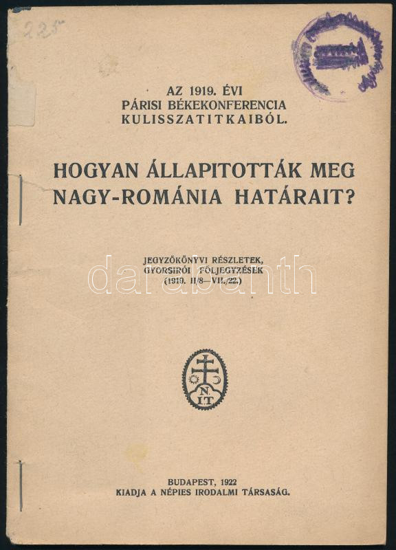 Description: Az 1919. évi párisi békekonferencia kulisszatitkaiból. Hogyan állapították meg Nagy-Románia határait? Jegyzőkönyvi részletek, gyorsírói följegyzések. (1919. II/8-VII./22.) Bp., 1922, Népies Irodalomi Társaság, 4+38 p. Egyetlen kiadás. Tűzött papírkötésben, bélyegzéssel.