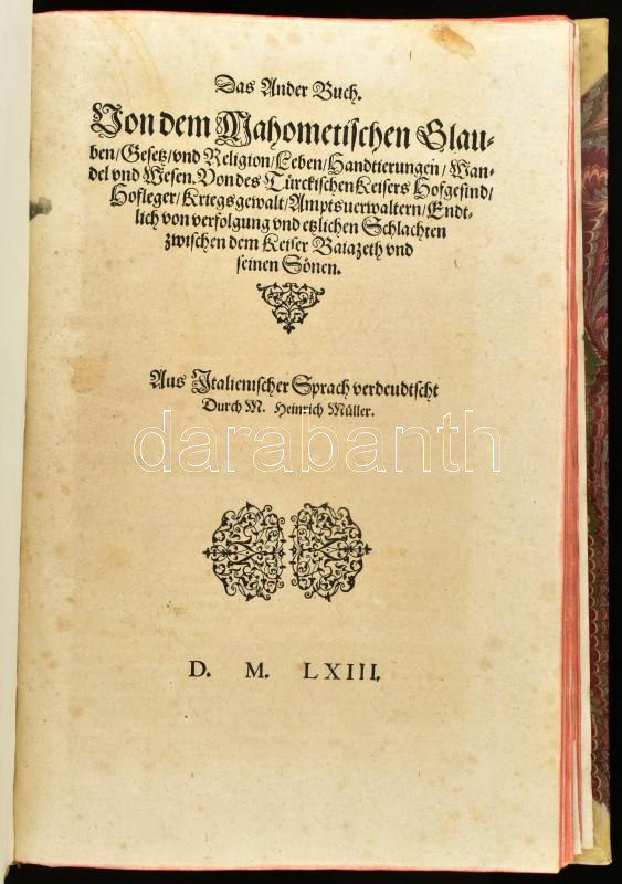 Von des Tuerckischen Keisers Hofgesind ... Endtlich von verfolgung ... zwischen dem Keiser Baiazeth vnd seinen Sönen. Olaszból fordította Heinrich Müller. [Frankfurt, Main], 1563, [Georg Rab és Weigand Han]. 105, [4] Fametszetű címképekkel és portrékkal. Hiány: 18-24. levél. Az utolsó néhány levélen szúrágás nyomával. Igényes későbbi félpergamen kötésben, festett lapszélekkel. / Missing pages 18-24 in later half pergamin binding with some holes on the last pages