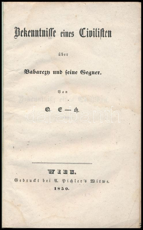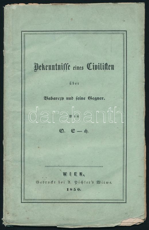 [Johann] Q[uirin] E[ndli]ch: Bekenntnisse eines Civilisten über Babarczy und seine Gegner. Von Q. E-ch. Wien, 1850., A. Pichler's Witwe, 50 p. Kiadói papírkötés, foltos.