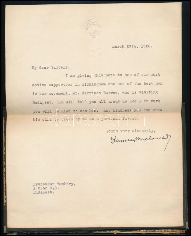 MacDonald, James Ramsay: A szocialista mozgalom. Bp.,1924.,Franklin, 219 p. Félvászon kötés, kopottas állapotban. + 1926 Benne a szerző, James Ramsay MacDonald (1866-1937) brit politikus gépelt levelével Vámbéry Rusztem (1872-1948) magyar jogász, polgári radikális publicista részére, autográf aláírásával.