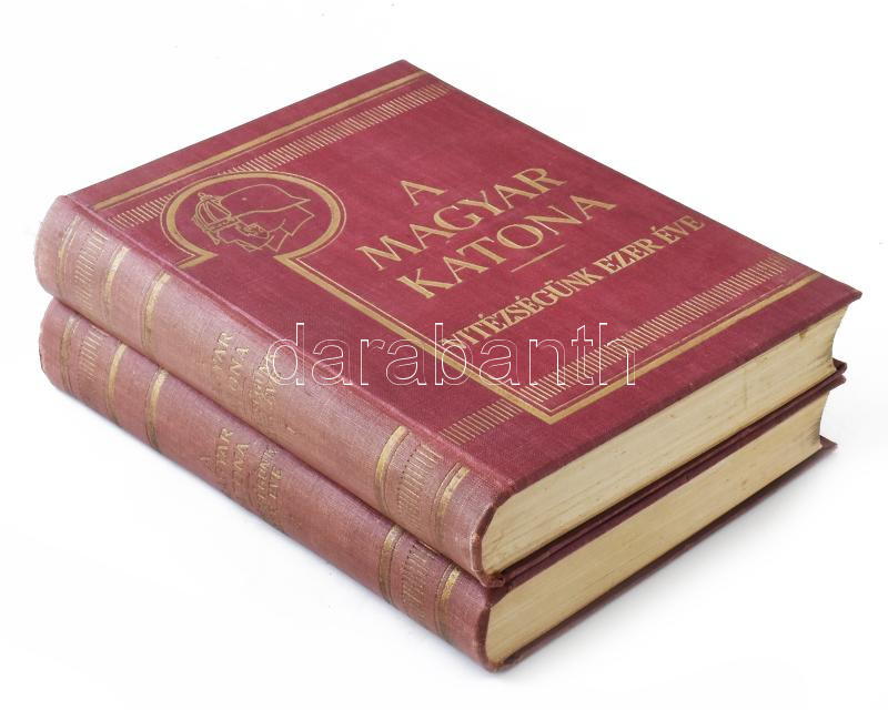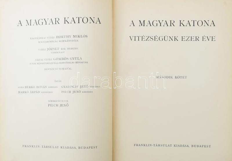 A magyar katona. Vitézségünk ezer éve I-II. Szerk. Pilch Jeno. 435 képpel, vázlattal és 10 melléklettel. Nagybányai Vitéz Horthy Miklós Magyarország kormányzója, Vitéz József kir. herceg tábornagy, Jákfai Vitéz Gömbös Gyula m. kir. miniszterelnök és honvédelmi miniszter bevezető soraival. Bp., 1933, Franklin-Társulat. Kiadói aranyozott egészvászon-kötésben, enyhén napszítta gerinccel, egy két lapon kissé foltos