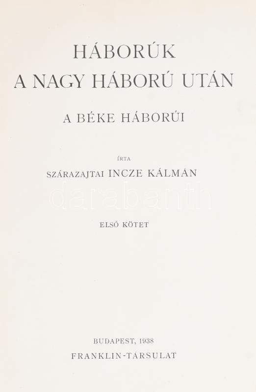 Incze Kálmán, Szárazajtai: Háborúk a nagy háború után. A béke háborúi.... https://www.darabanth.com/en/41-Major-auction/41.1/Books/Books-Military~16800/Incze-Kalman-Szarazajtai-Haboruk-a-nagy-haboru-utan-A-beke-haborui-1-2-kot-Bp-1~II2979741