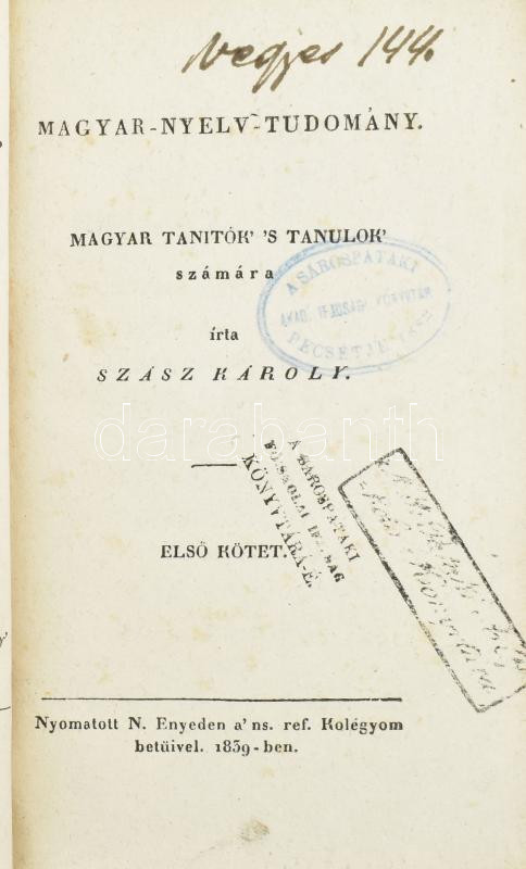 Szász Károly: Parthenon. Tanitmányok tára. Magyar tanitók' 's tanulók' számára. I. és II. füzet. Nagyenyed, 1839.Ref. Kolégyom. 188 + 32p. Kiadói papÃrborÃtóval, intézményi bélyegzÅ‘kkel
