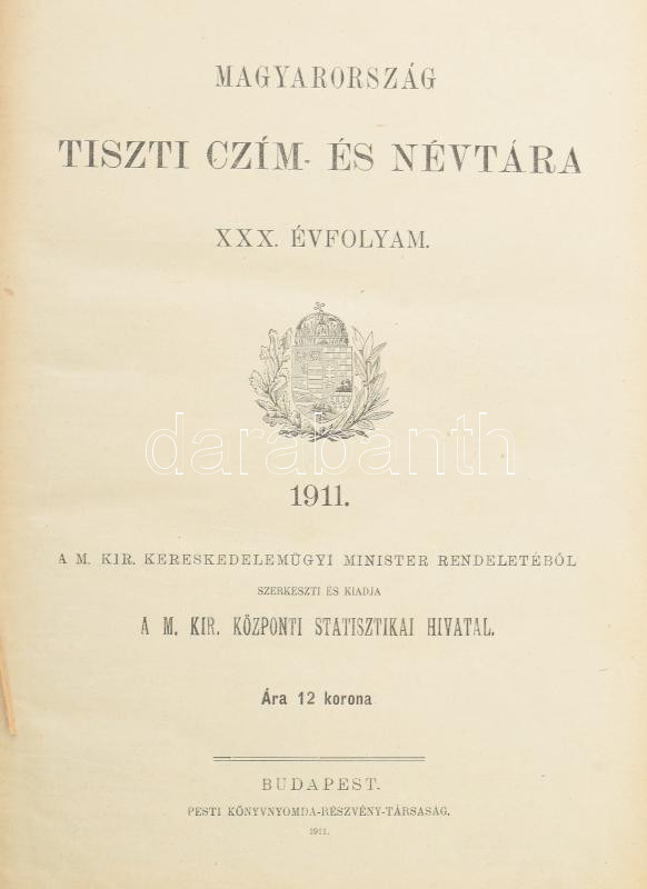 1911 Magyarország tiszti czím- és névtára XXX. évf. 1911. Szerk. és kiadja a M. Kir. Központi Statisztikai Hivatal. Bp., 1911., Pesti Könyvnyomda Rt., XIV+2+950+46 (korabeli reklámok) p. Kiadói piros egészvászon-kötés, Müller György-kötés, kopott, foltos borítóval, a gerincen kis sérüléssel, kijáró elülső szennylappal.