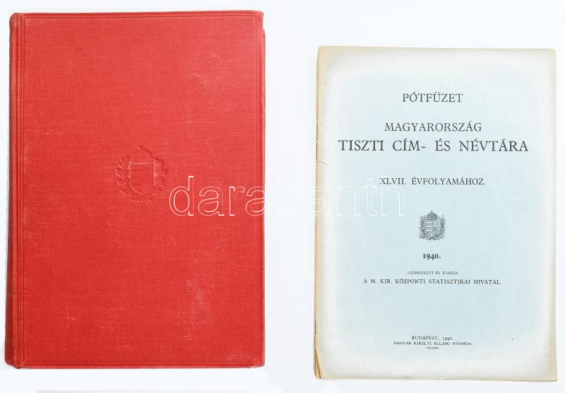 1940 Magyarország tiszti cím- és névtára. XLVII. évf. 1940. Szerk. és kiadja a M. Kir. Központi Statisztikai Hivatal. Bp., 1940., Magyar Királyi Állami Nyomda,XVI+760+32 (korabeli reklámok) p. Kiadói piros egészvászon-kötés, Müller György-kötés, kopott borítóval, a gerincen kis sérüléssel. +Hozzá: Pótfüzet Magyarország tiszti cím- és névtára XLVII. évfolyamához. 1940. Szerk. és kiadja a M. Kir. Központi Statisztikai Hivatal. Bp., 1940., Magyar Királyi Állami Nyomda,32 p. Kiadói papírkötés, szakadt borítóval.