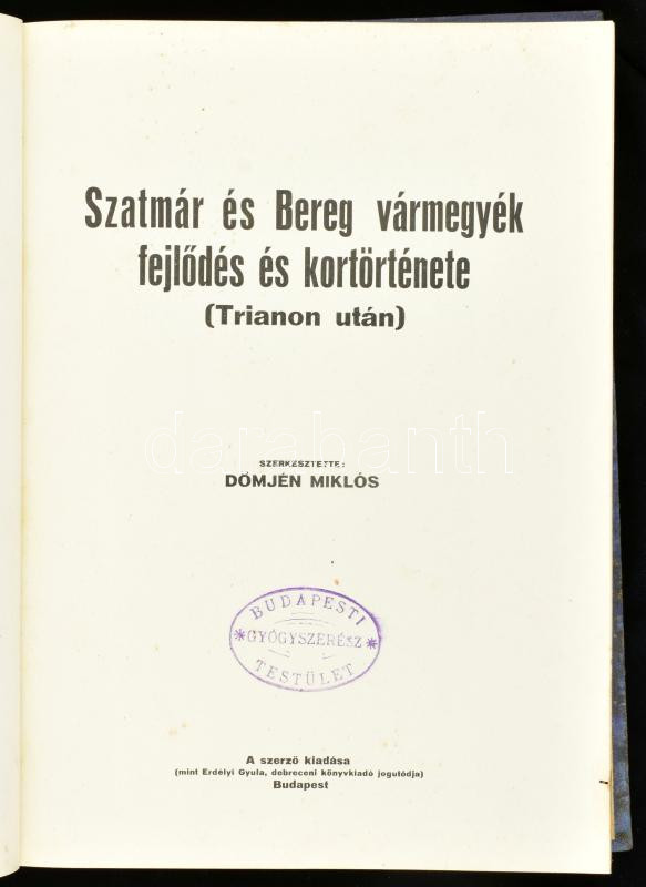Dömjén Miklós szerk.: Szatmár és Bereg vármegyék fejlődése és kortörté... https://www.darabanth.com/en/41-Major-auction/41.1/Books/Books-Travelling-Local-History~16797/Domjen-Miklos-szerk-Szatmar-es-Bereg-varmegyek-fejlodese-es-kortortenete-Trianon-utC3~II3001788