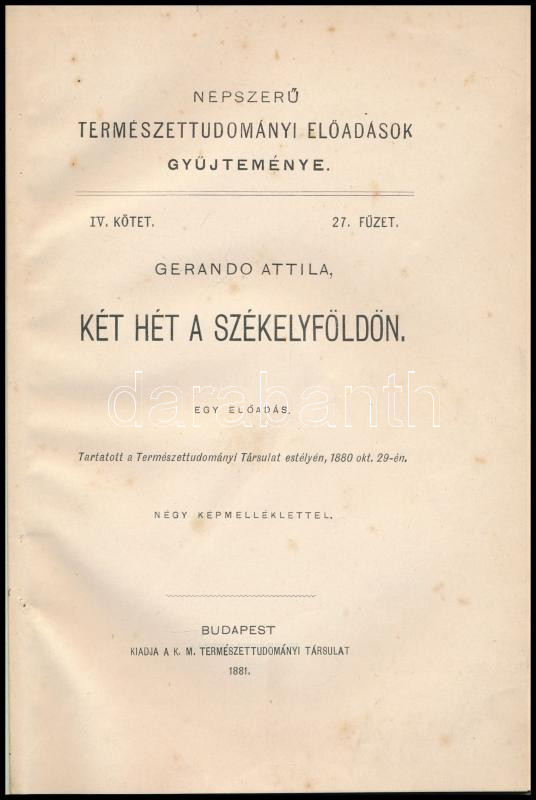 Gerando Attila: Két hét a Székelyföldön Bp., 1881. K. M. Természettud. Társulat. 38+(1)p.+4t. (Népszerű természettudományi előadások gyüjteménye. IV. kötet. 27. füzet.) Modern vászon-kötésben az eredeti papír címlap felhasználásával