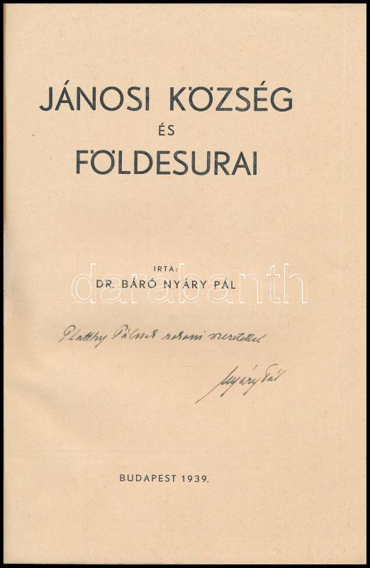 Nyáry Pál, Dr. báró: Jánosi község és földesurai. (Rimajánosi / Rimavské Janovce, Felvidék). Bp., 1939, szerzői kiadás (Orsz. Központi Községi Nyomda Rt.), 48+(2) p. Kiadói papírkötés. A szerző által Platthy Pál katonatiszt részére DEDIKÁLT példány.