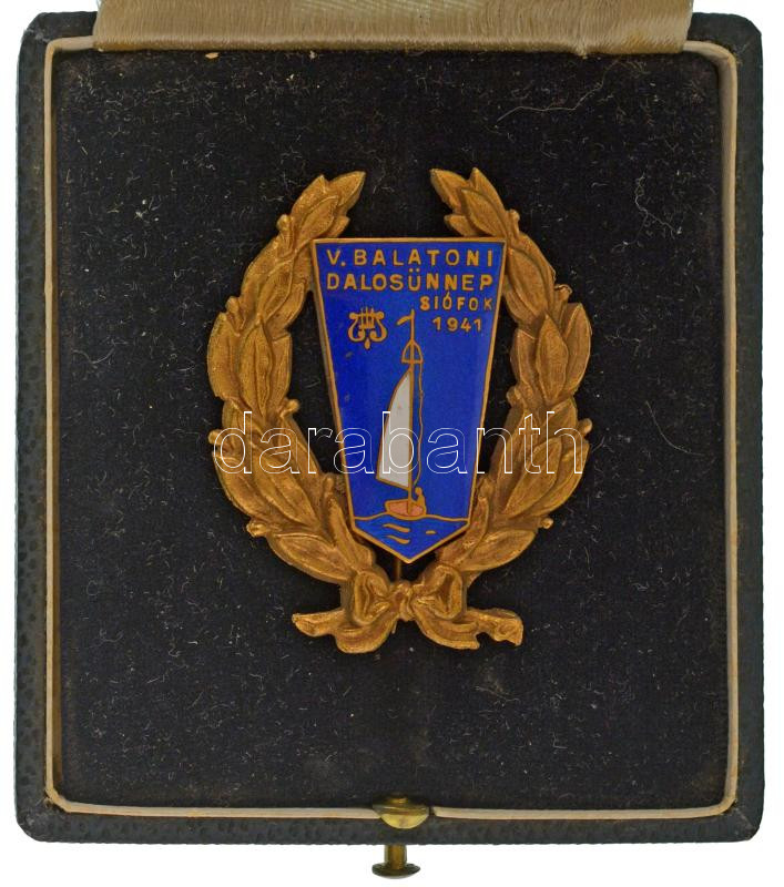 1941. "V. Balatoni Dalosünnep Siófok 1941" zománcozott bronz jelvény "Boczán Károly" gyártói jelzéssel, eredeti jelzett "Boczán" gyártói dísztokban (47x39mm) T:AU / Hungary 1941. "V. Balatoni Dalosünnep Siófok 1941" enamelled bronze badge with "Boczán Károly" maker's mark in original "Boczán" display case (47x39mm) C:AU