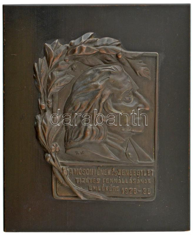 1936. "A Mosoni Ének és Zeneegylet tízéves fennállásának emlékére 1926-1936" Liszt Ferenc jobbra néző portréját ábrázoló bronz plakett kitámasztható fa talapzaton. Szign.: RK (210x158mm, fa talp 284x240mm) T:AU / Hungary 1936. "A Mosoni Ének és Zeneegylet tízéves fennállásának emlékére 1926-1936" cast bronze plaque with the right looking portrait of Ferenc Liszt on wooden base. Sign.: RK (210x158mm, wooden base 284x240mm) C:AU