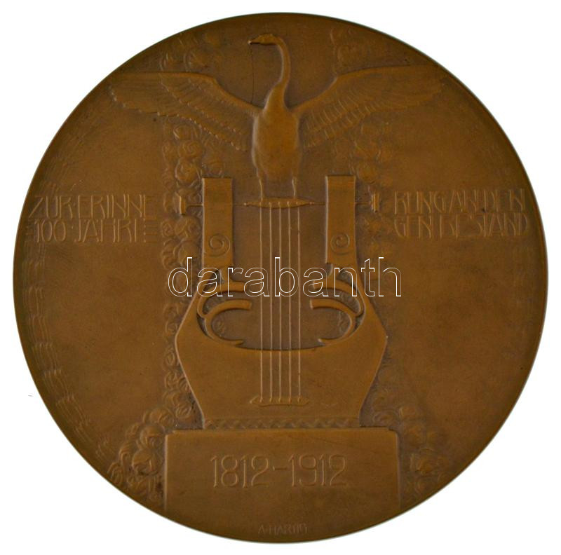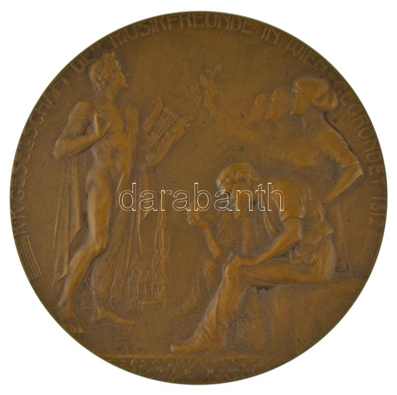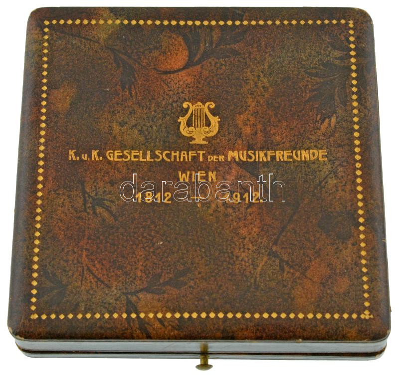 Osztrák-Magyar Monarchia 1912. "K.K. GESELLSCHAFT DER MUSIKFREUNDE IN WIEN GEGRÜNDET 1812 / ZUR ERINNE-RUNG AN DEN 100 JAHRI-GE BESTAND 1812-1912 (A Császári és Királyi Zenekedvelők Társasága, Bécs alapítva 1812 / A százéves fennállás emlékére)" kétoldalas bronz emlékérem, eredeti sérült "K. U. K. GESELLSCHAFT DER MUSIKFREUNDE WIEN 1812-1912" dísztokban. Szign.: Arnold Hartig (76mm) T:UNC / Austro-Hungarian Monarchy 1912. "K.K. GESELLSCHAFT DER MUSIKFREUNDE IN WIEN GEGRÜNDET 1812 / ZUR ERINNE-RUNG AN DEN 100 JAHRI-GE BESTAND 1812-1912" double-sided bronze medallion in original albeit damaged "K. U. K. GESELLSCHAFT DER MUSIKFREUNDE WIEN 1812-1912" display case. Sign.: Arnold Hartig (76mm) C:UNC
