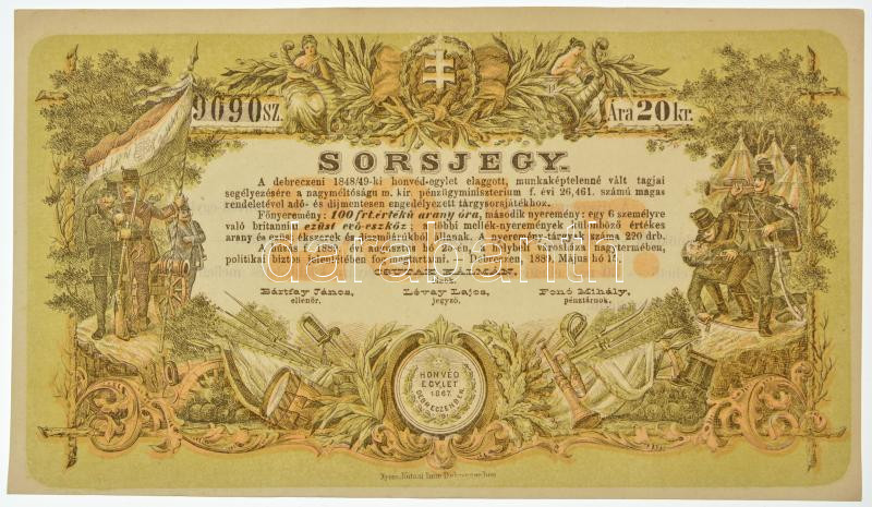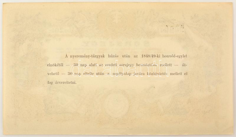 Description: Debrecen 1889. "A debreczeni 1848/49-ki honvéd-egylet elaggott, munkaképtelenné vált tagjai segélyezésére" sorsjegy 20kr értékben T:AU / Hungary / Debrecen 1889. "To help the members of the 1848/49 Veterans' Association in Debrecen who became obsolete and incapacitated for work" lottery ticket in 20 Kreuzer value C:AU