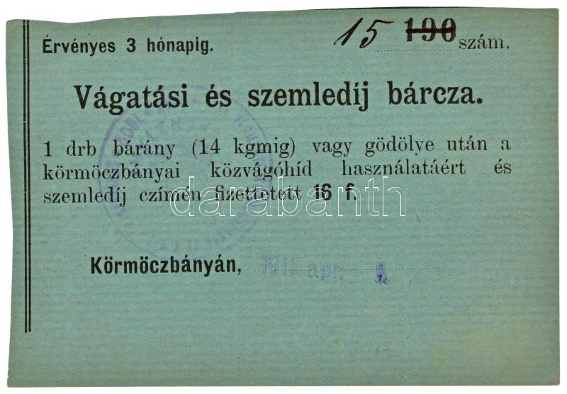 Körmöcbánya 1915. Vágatási és szemledíj bárca, sorszámmal, pecséttel é... https://www.darabanth.com/en/41-Major-auction/41.1/Numismatics/Shares-tickets-emergency-coins-and-notes~16837/Kormocbanya-1915-Vagatasi-es-szemledij-barca-sorszammal-pecsettel-es-datumbelyegzov~II3007402