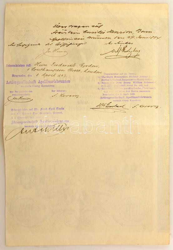 Német Birodalom / Apollinarisbrunnen bei Ahrweiler 1876. "Apollinarisbrunnen Részénytársaság" részvénye 300M-ról szárazpecséttel, bélyegzésekkel T:VF / German Empire / Apollinarisbrunnen bei Ahrweiler 1876. "Aktiengesellschaft Apollinarisbrunnen (Apollinarisbrunnen Share Company)" share about 300 Mark, with embossed stamp and overprints C:VF