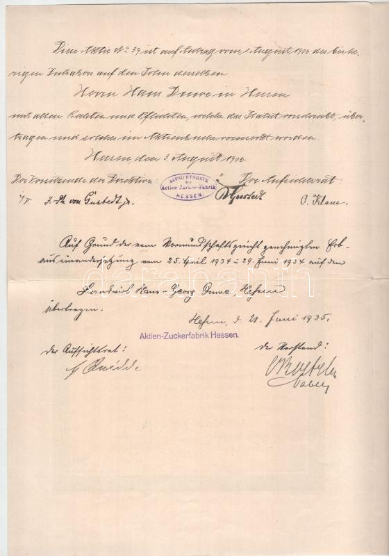 Description: Német Birodalom / Hessen 1899. "Hesseni Cukorgyár" részvénye 1500M-ról bélyegzésekkel T:F / German Empire / Hessen 1899. "Actien-Zucker-Fabrik Hessen (Sugar Factory of Hessen)" share about 1500 Mark with stamps C:F