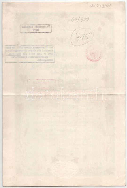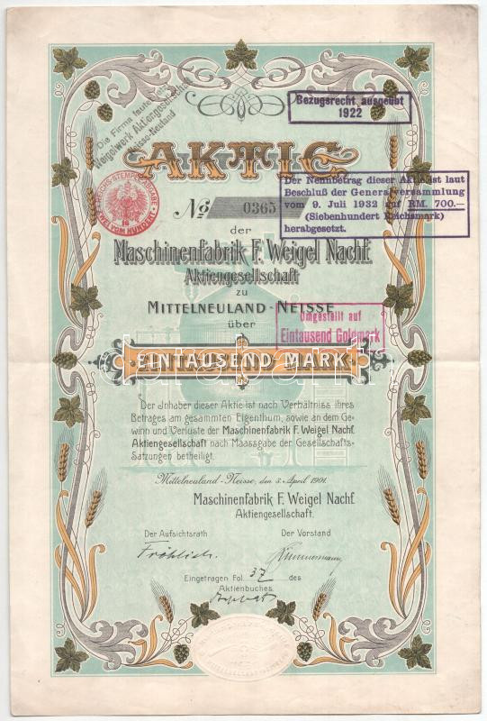 Német Birodalom / Mittelneuland-Neisse 1901. "Mittelneuland-Neisse-i F. Weigel Utóda Gépgyár Részvénytársaság" részvénye 1000M-ról szárazpecséttel, felülbélyegzésekkel T:F / German Empire / Mittelneuland-Nesse 1901. "Maschinenfabrik F. Weigel Nachfolger Aktiengesellschaft zu Mittelneuland-Neisse" share about 1000 Mark with embossed stamp and overprints C:F