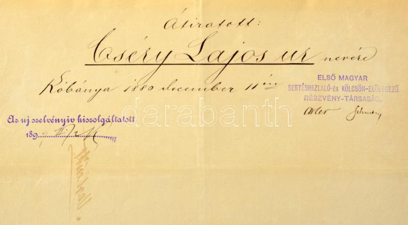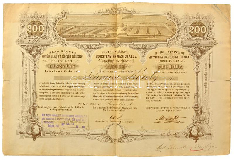 Pest 1871. "Első Magyar Sertéshizlaló és Kölcsön Előlegező Társulat" részvénye 200Ft-ról szárazpecséttel, bélyegzésekkel, szelvényekkel, lyukasztásokkal T:F tűlyukak, beszakadások / Hungary / Pest 1871. "Első Magyar Sertéshizlaló és Kölcsön Előlegező Társulat" share about 200 Forint with emobssed stamp, overprints and coupons, with holes C:F needle holes, small tears