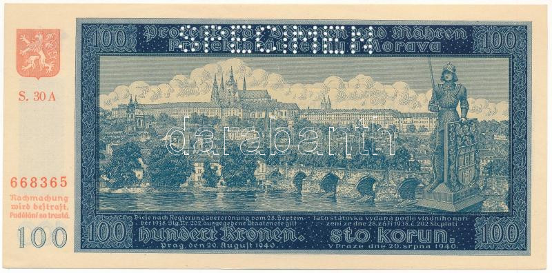 Description: Német Harmadik Birodalom / Cseh-Morva Protektorátus 1940. 100K második kiadás, "SPECIMEN" perforációval, "S. 30 A 668365" T:AU / German Third Reich / Protectorate of Bohemia and Moravia 1940. 100 Korun second issue, with "SPECIMEN" perforation, "S. 30 A 668365" C:AU Krause 7.s