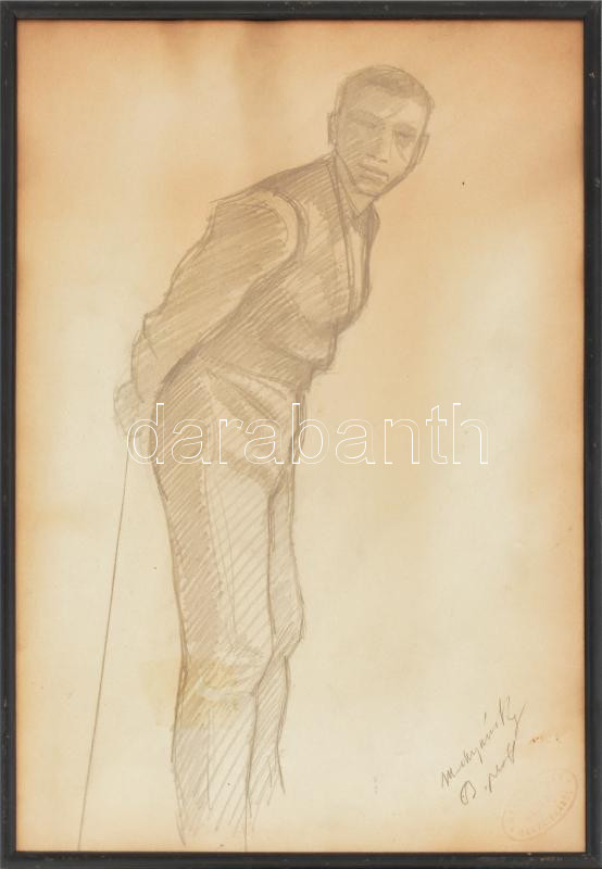 Description: Báró Mednyánszky László (1852-1919): Alak (tanulmány). Ceruza, papír. Jelezve jobbra lent. Mednyánszky hagyatéki bélyegzővel. Üvegezett fakeretben. 42x29 cm / László Mednyánszky, Ladislav Medňanský (1852-1919): Standing figure (study). Pencil on paper. Signed lower right. With Mednyánszky estate stamp. Framed. 42x29 cm