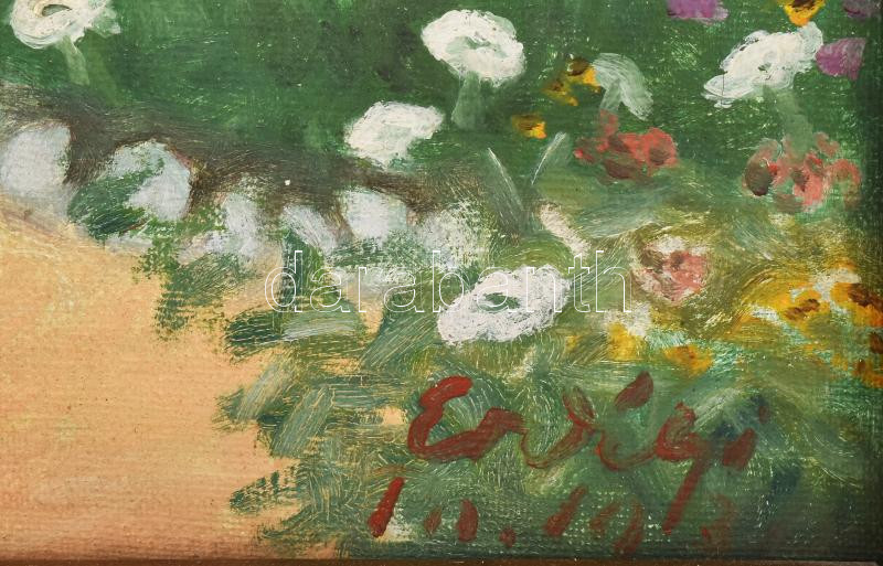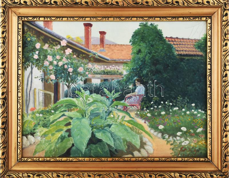 Erdélyi Béla (1891-1955): Hölgy virágok közt (Jakula Kálmánné, Neumayer Mária. Jakula Kálmán, Erédlyi Béla barátjának felesége). 1930-as évek. Olaj, vászon. Jelezve jobbra lent. Dekoratív fakeretben. 45x60 cm / oil on canvas, signed, slightly damaged, framed., 1930-as évek. Olaj, vászon. Jelezve jobbra lent: Jakula Kálmánnak barátsággal, Erdélyi Béla. Jelezve balra lent: 1933. Kissé sérült. Dekoratív, kissé sérült fakeretben. 45x60 cm / oil on canvas, signed, framed.