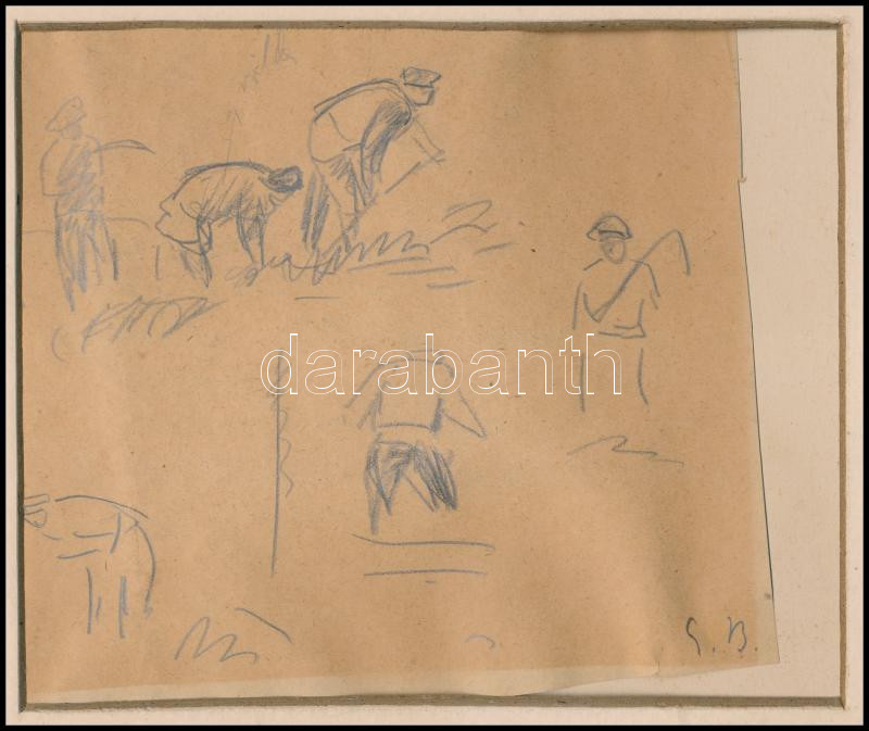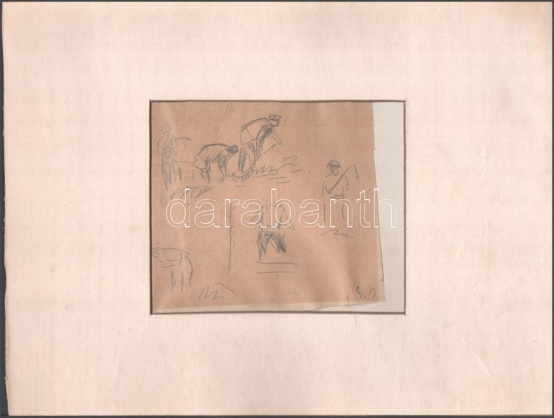 Description: Iványi-Grünwald Béla (1867-1940): Aratási tanulmány. Ceruza, papír, jelezve jobbra lent: G B. Lap sarkai kartonra rögzítve. Paszpartuban. 15x18 cm / pencil on paper, signed