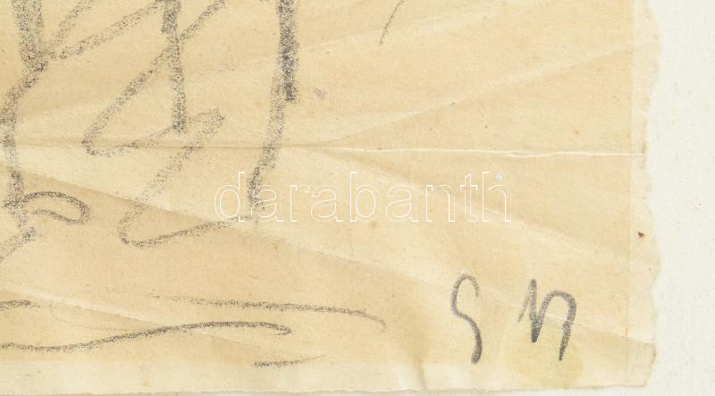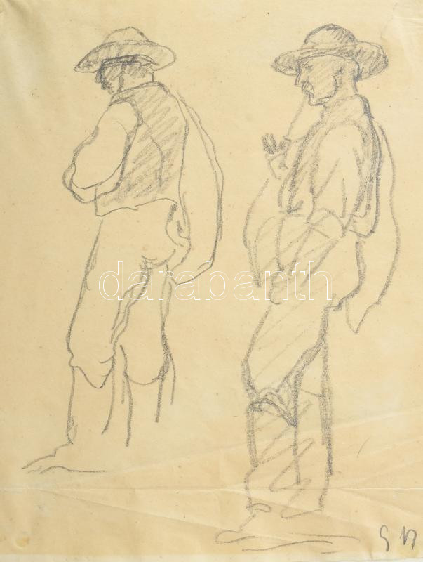 Description: Iványi-Grünwald Béla (1867-1940): Parasztok (tanulmány). Ceruza, papír, jelezve jobbra lent: G B. Lap sarkai kartonra rögzítve. Gyűrődésekkel. 20x16 cm / pencil on paper, signed