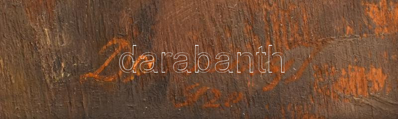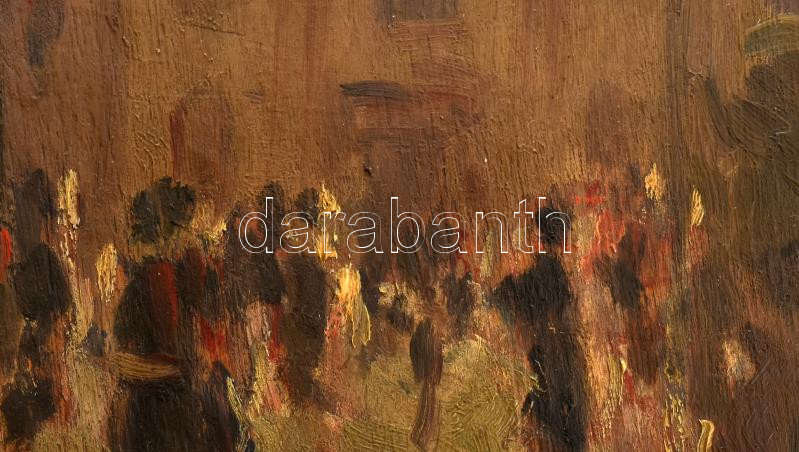 Description: Vitéz Darvassy István (1888-1960): Ferenciek terei forgatag, Budapest, 1920-as évek. Olaj, falemez, jelezve jobbra lent. Dekoratív, sérült fakeretben. 38,5x28 cm / oil on wood, signed, framed