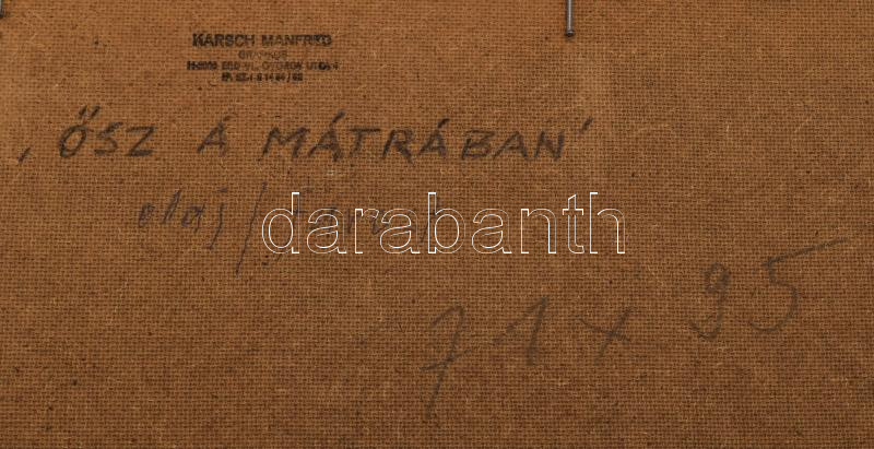 Karsch, Manfred (1948-): Ősz a Mátrában, 1997. Olaj, farost, jelezve jobbra középen lent, hátoldalán autográf felirattal. és művész bélyegzőjével. Fakeretben. 71x95 cm / oil on fibre board, signed, with the artist's stamp and autograph description on the reverse, framed