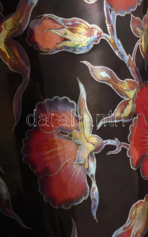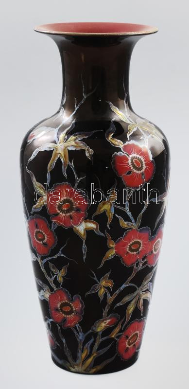 Zsolnay többtüzű váza virág díszítéssel. Kifelé szélesedő öntött vázatest, beszűkülő nyakkal, kinyíló szájrésszel. Felületén többrétegű fémes fényű színes eozinmázakkal festett, sötét alap felett fémlüszteres virágmintákkal. Alján jelezve eozin öttornyos gyári jellel. 1990 körül, minimális kopottsággal, m: 28 cm