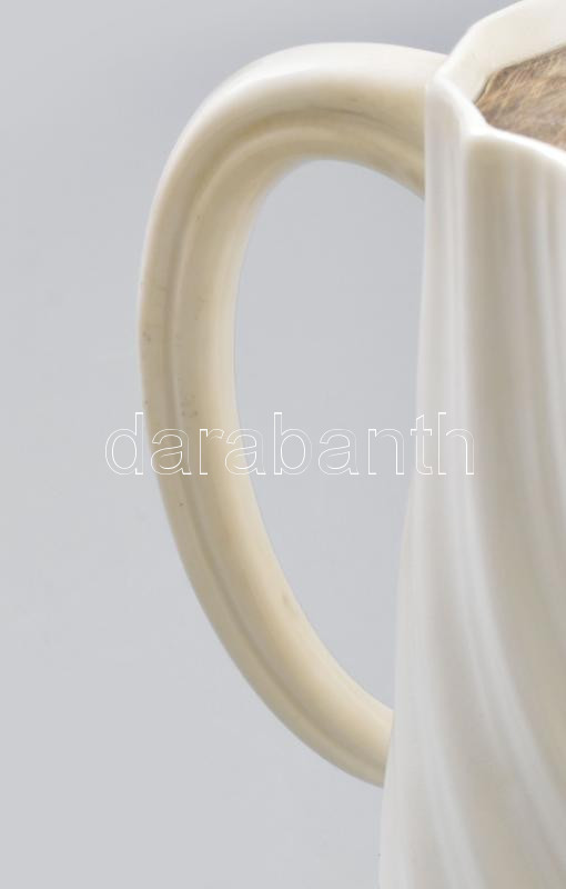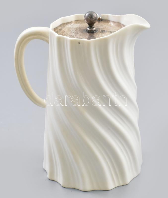 Description: cca 1920 Hukin & Heath art nouveau csavart testű tejporcelán kancsó, címeres ezüstözött fém billenő fedéllel, félrehajló füllel. Mázrepedezett, alján és fedelén is jelzett, m: 20 cm