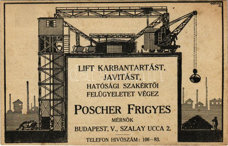 Description: Lift karbantartást, javítást, hatósági szakértői felügyeletet végez Poscher Frigyes mérnök. Budapest V. Szalay utca 2. reklámlap / Hungarian engineer's advertisement postcard. Elevator maintenance, repair, and official expert supervision s: Kebely