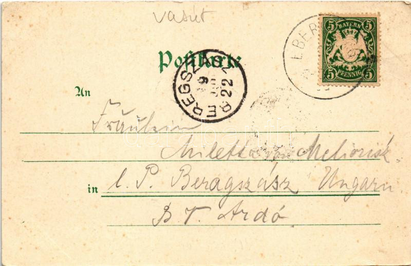 Description: 1899 (Vorläufer) Ebernburg (Bad Kreuznach), Restauration im Burghof, Ulrich von Hutten und Franz von Sickingen Denkmal / restaurant, monument, railway bridge, locomotive, train. Karl Scheffel Art Nouveau, floral, litho (small tear)