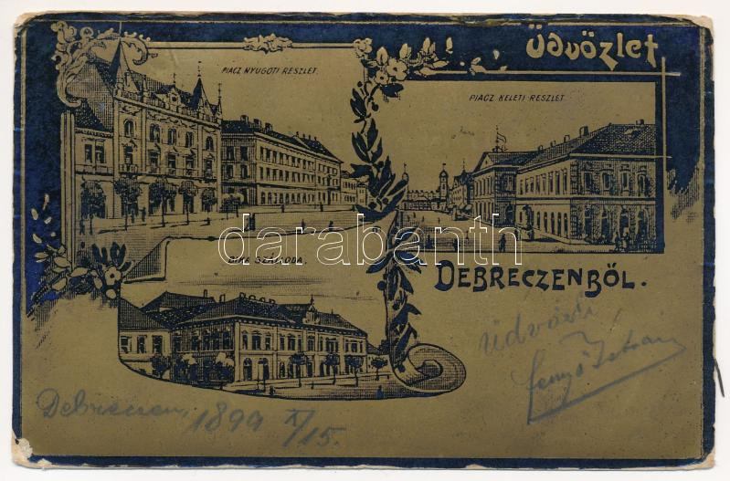 1899 (Vorläufer) Debrecen, Piac nyugati és keleti részlete, Bika szálloda. Szecessziós fémes hatású fóliás képeslap / Art Nouveau, floral (kopott / worn)
