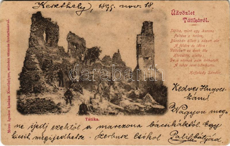 1899 (Vorläufer) Zalaszántó, Tátika várrom kirándulókkal, Kisfaludy Sándor verse. Mérei Ignác kiadása (Rb)
