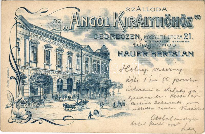 1900 Debrecen, Szálloda az Angol Királynőhöz. Kossuth utca 21. a színházzal szemben, tulajdonos Hauer Bertalan. Posner kiadása, Art Nouveau, floral