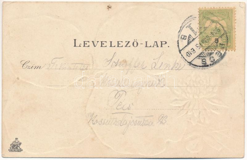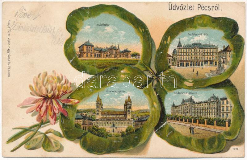 1904 Pécs, indóház, vasútállomás, Széchenyi tér, székesegyház, hadapród iskola. Fürst Lipót kiadása, szecessziós dombornyomott montázs lóherével, Art Nouveau, Emb. litho (EK)