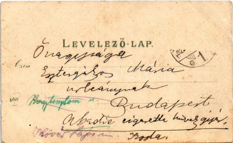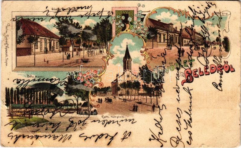 Beled (Kapuvár), Gönye vendéglője, étterem, Fő tér, Béla major, Római katolikus templom. Ludwig Kummert 4018. Art Nouveau, floral, litho (EB)