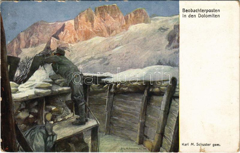 Description: Beobachterposten in den Dolomiten. Offizielle Karte für Rotes Kreuz, Kreigsfürsorgeamt, Kriegshilfsbüro Nr. 519. / WWI Austro-Hungarian K.u.K. military art postcard s: Karl. M. Schuster (EK)
